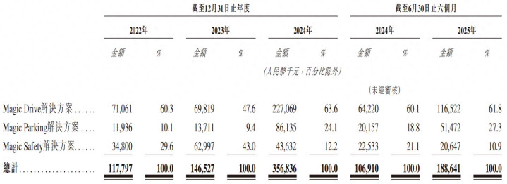 按照产品类型划划分,魔视智能共拥有行车解决方案、自动泊车解决方案、主动安全解决方案三大业务板块。其中,行车解决方案业务是营收的重要支柱。2025年上半年,该业务以1.17亿元的成绩为魔视智能贡献了61.8%的营收,较2024年上半年增长82.81%。2022年至2024年,其收入由0.71亿元增长至2.27亿元,复合年均增长率高达78.7%,是魔视智能营收增长的核心驱动力。